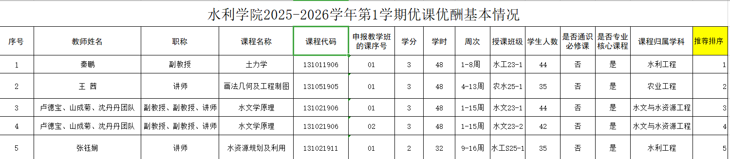 根据《浙江水利水电学院“优课优酬”奖励实施办法(试行)》(浙水院〔2024〕35号)、《水利工程学院“优课优酬”奖励办法实施细则》(浙水院水利〔2024〕4号)规定,经任课教师自主申报,学院“优课优酬”奖励推荐组审核初评,推荐以下教师(团队)申报校级2026-2026学年第一学期“优课优酬”奖励,现予以公示。