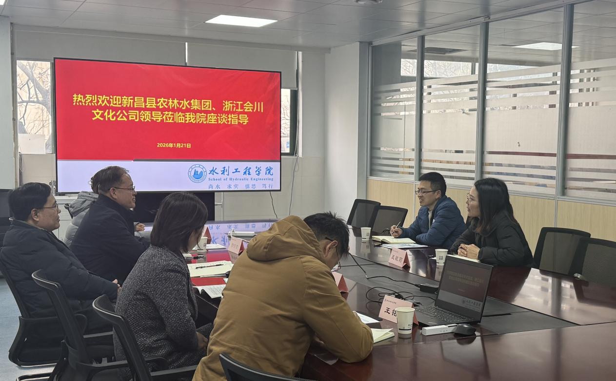 为深化产教融合,服务地方水利事业与产业发展,1月21日上午,水利工程学院与新昌县农林水集团有限公司及其下属浙江会川文化发展有限公司在学院206会议室举行合作交流座谈会。新昌县农林水集团副总经理王毓莉、浙江会川文化公司副经理娄承裕一行到访交流。校学科处处长韩宇平、河湖长学院副院长罗湘萍,水利工程学院院长徐存东及学院领导班子成员、相关教师代表共同出席会议。
