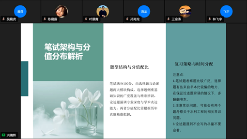 为助力水利学子高效备战考研复试,水利工程学院于3月18日晚举办了2026年考研复试经验线上分享会。本次分享会旨在帮助同学们深入了解复试流程、掌握面试技巧、调整备考心态,吸引了50余位同学在线参与。会议由缪凯伦主持,特邀4位在去年考研复试中表现优异、成功上岸的优秀学长分享宝贵经验。