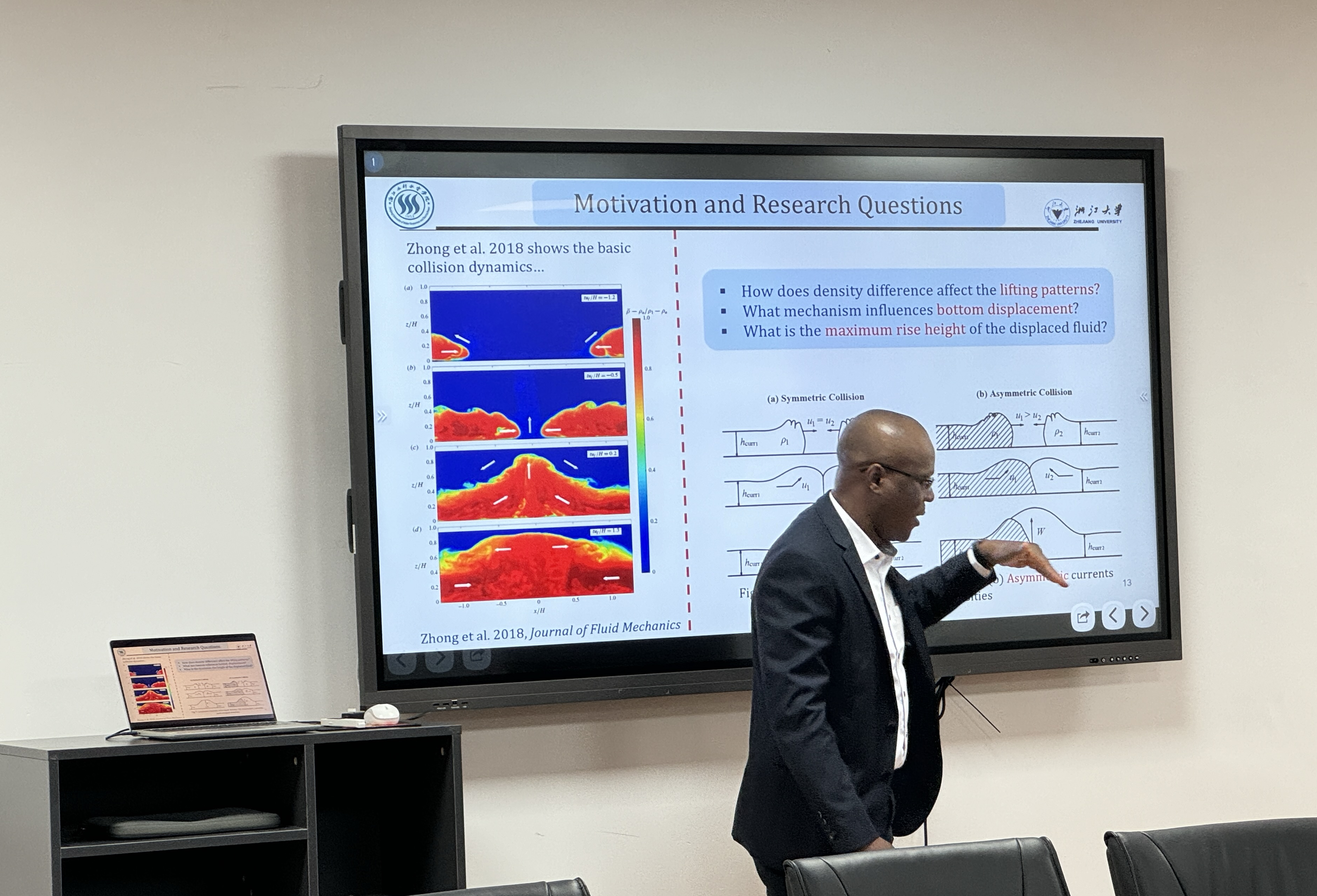 首先,学院崔同和周宇博士分别针对水文方向海岸河流模型分析和出国访学申请及访学期间学术合作等进行了交流,两位博士的分享让大家对交叉学科合作以及地方合作访学项目有了更直观的理解。尼日利亚籍浙江大学海洋工程博士后Dr. Samuel Ukpong Okon以《Gravity Currents in the Environments》为题,全面阐述了高密度海底浊流和悬浮管道之间的相互作用等内容,并分享自己在尼日利亚阿克瓦伊博姆州立大学的任职经历,为大家提供了国际交流合作的思路与机会。